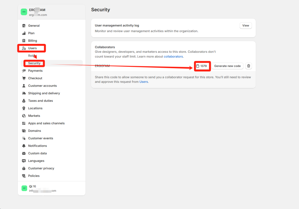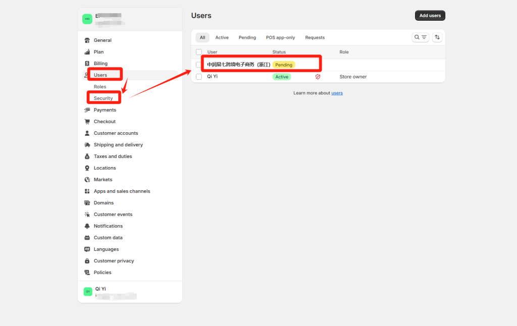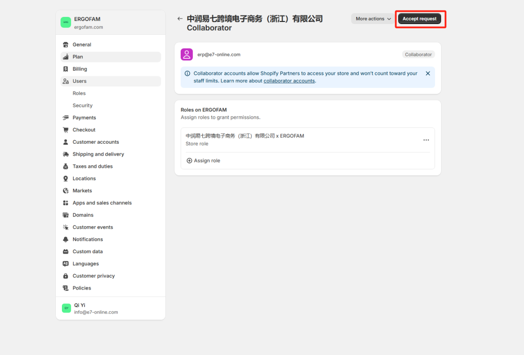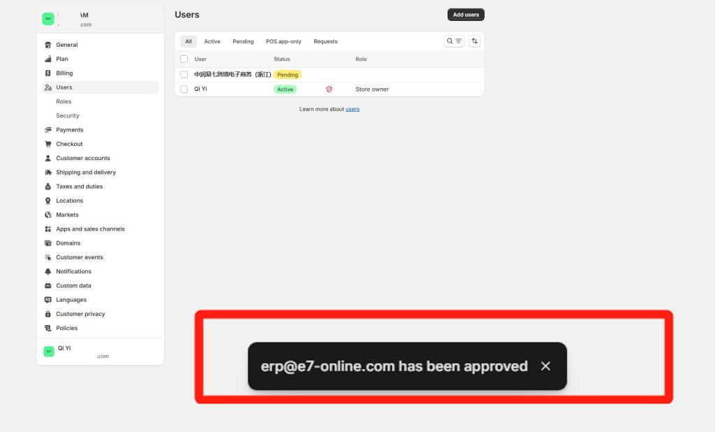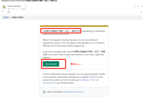 How to Connect to our eRP system Here is a picture tutorial for connecting your store to our system. 1. Search dianxiaomi in the search box, click to download 2. After dianxiaomi app is displayed in the apps list, the first stage is completed 3. Click On Setting, Users And Security. 4. Send "Collaborator Request Code" & "your website link" to your agent 5. check your email After a few minutes, you will receive an email as shown in the picture in your Shopify Email 6. Click View request 7. Click Review request in the Users and Security page 8. Click Accept request 9. After has been approved window pops up, the authorization is successful and notice to your agent.